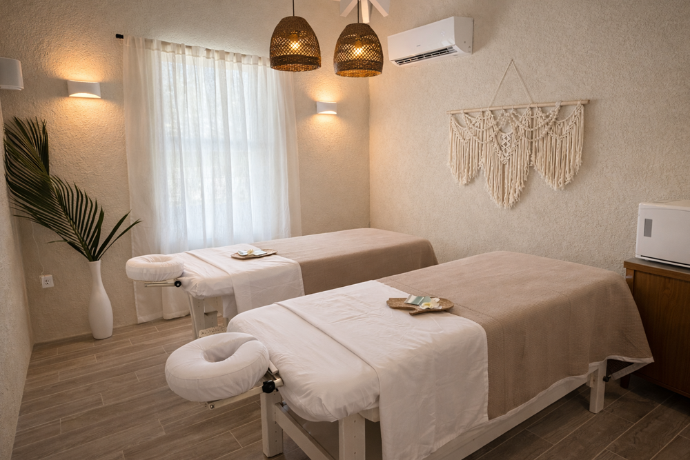 A serene atmosphere, including ambient lighting, calming music, island-inspired scents designed to support relaxation, and cooling cucumber or herbal eye pads during massages.